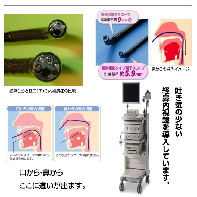 本クリニックでは 内視鏡検査での苦痛を和らげるため、フジノンの経鼻内視鏡(鼻からの胃カメラ)を導入しました。これまで行われていた胃カメラにくらべて、約1/4程度の太さであり、うどん程度の直径となっています。経口胃カメラに比べて 喉への刺激が極端に軽くなり、多くの方が「 楽だった。」と話されます。また、フジノン製の導入経鼻内視鏡は解像能が高く最高レベルでの診断が可能です。